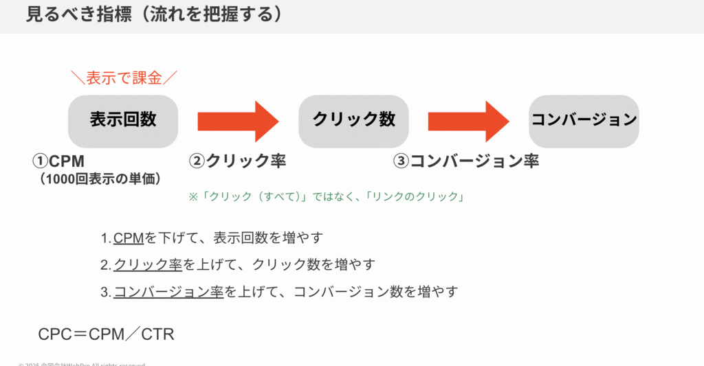 大切なのは、「コンバージョン単価だけ見て判断しない」こと。必ずクリック単価とコンバージョン率に分解して、さらにクリック単価が悪ければインプレッション単価とクリック率のどちらが原因かを見極める。この順番で診断することが、正しい改善への近道です。